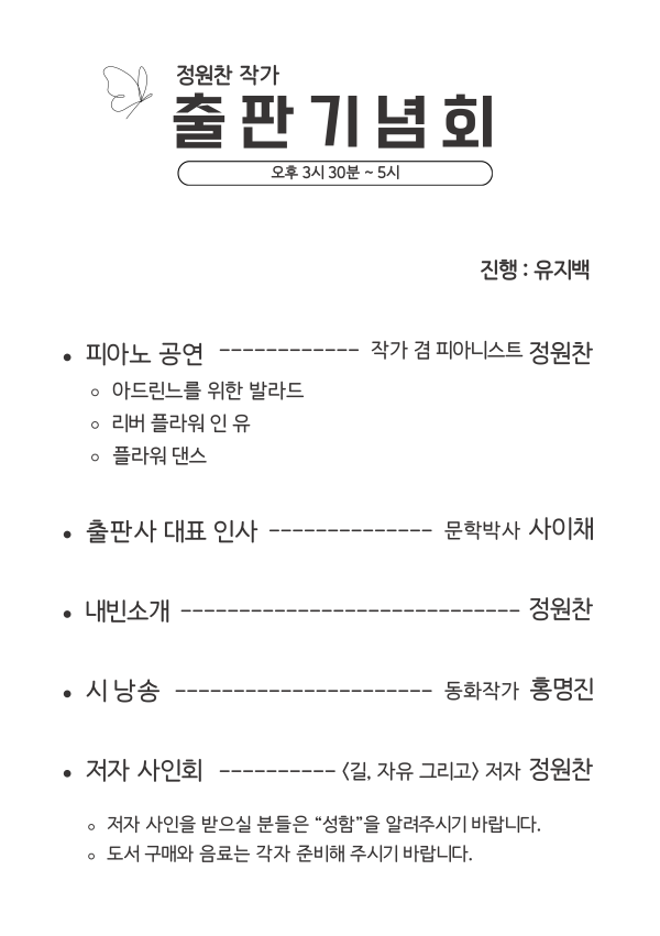 영화배우겸 작가 정원찬이 책도 내고 출판기념회를 연다. 포토에세이 길, 자유 그리고... 작성자 정보 킹티비 작성 작성일 2026.02.08 17:16 컨텐츠 정보 847 조회 목록 본문 영화 롤링 스톤의 주연배우로 활동했던 정원찬이 최근 작가로 데뷔하여 화제다. 원래 피아니스트로 활동하면서 틈틈이 글을 써온 것이 이번에 책으로 발간되었다. 영화 롤링스톤은 현재 개봉을 거쳐서 절찬 상영 중이다.정원찬배우겸 작가의 예능능력이 아주 돋 보이는 출판기념회 기대가 모아진다. 관련자료 이전 최가온 대한민국 최고의 스타로 발돋움 점프 성공 작성일 2026.02.18 15:43 다음 K-POP 선구자로 널리 알려진 양준영 프로듀서 힙합대상 수상 작성일 2026.02.01 22:52 댓글 0 등록된 댓글이 없습니다. 로그인한 회원만 댓글 등록이 가능합니다. 목록